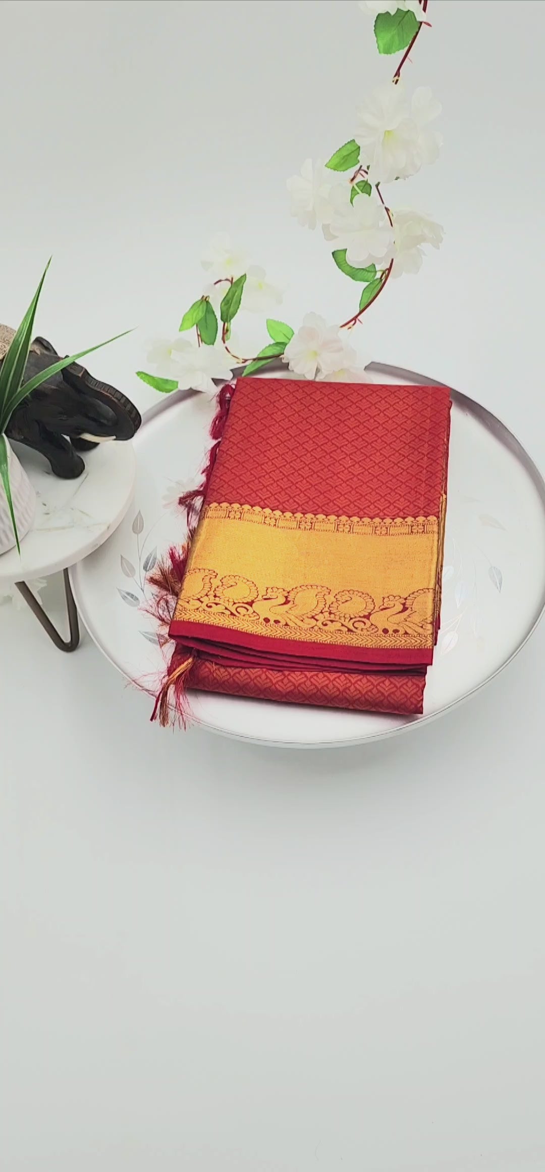 Experience the luxurious elegance of our Kancheepuram Silk Saree. Hand-woven with fine quality silk, this saree features intricate golden borders that add a touch of opulence to its vibrant red color. Wrap yourself in beauty and grace with this traditional saree.