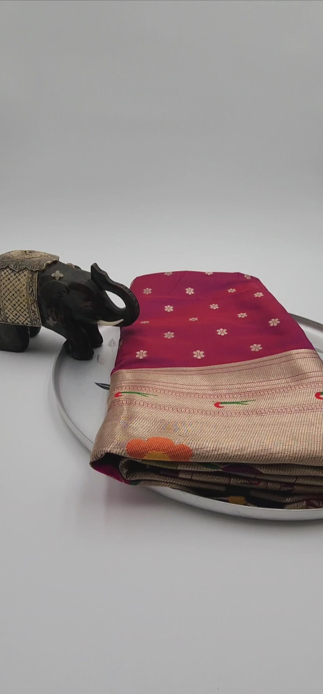 Enhance your fashion with a Paithani designer Silk Saree. Handcrafted in the expert silk fabric hub of Paithan, this saree showcases traditional mundhani and vibrant hues. The intricate mundhani design is eye-catching with a mix of dark metallic maroon and shimmering silver, featuring birds on a branch. Measuring at a full length of 6.5 meters and made with pure Paithani silk, this saree exudes elegant sophistication.