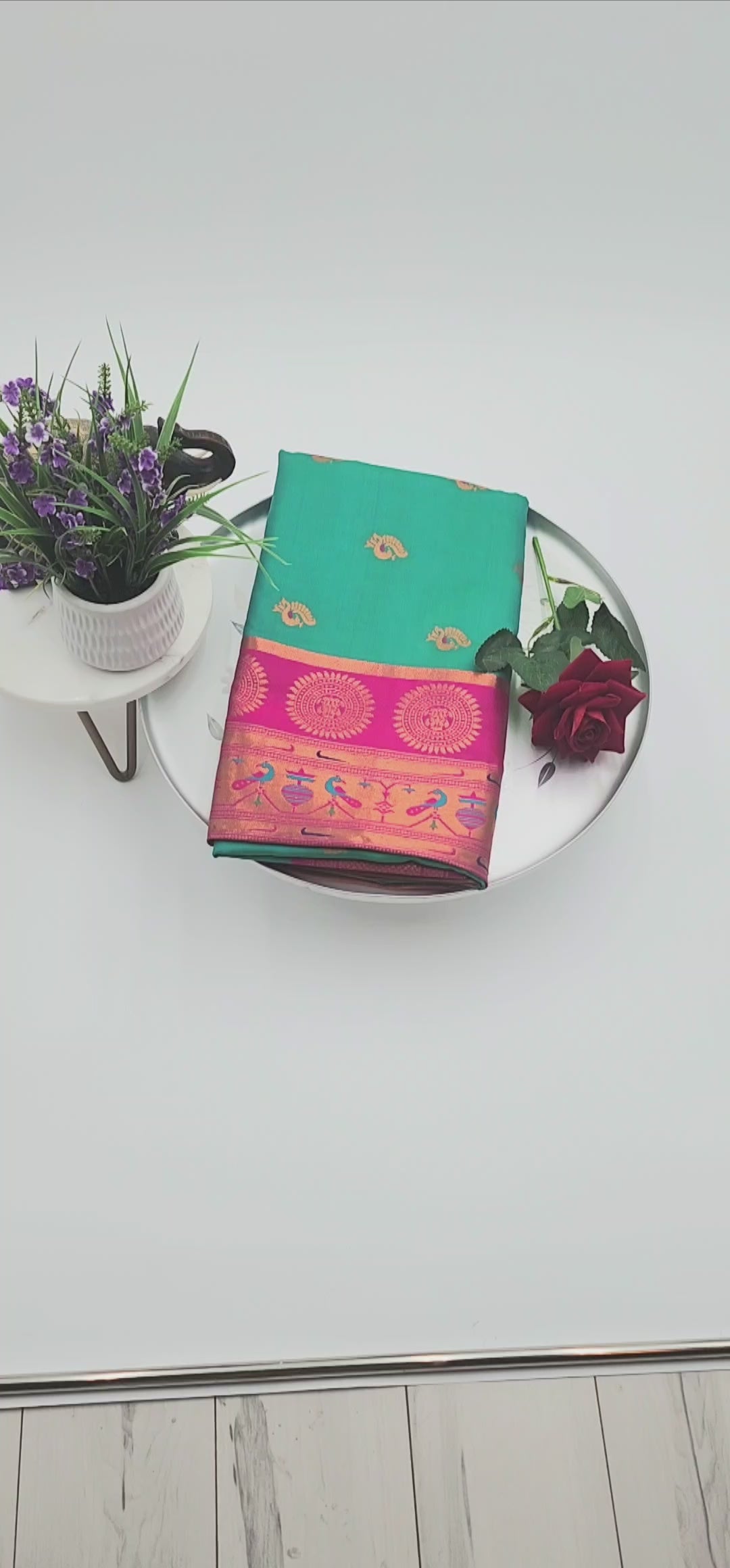 Expertly crafted with soft Peshwai Paithani Silk fabric, this saree features striking gold and violet silky borders. Its luxurious material ensures a comfortable and elegant look for any occasion. Elevate your traditional ensemble with this beautiful combination.
